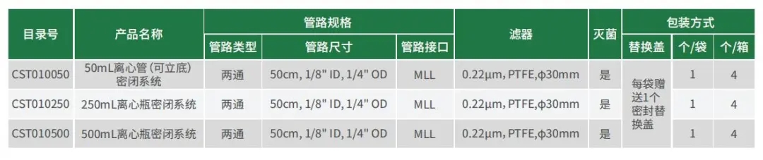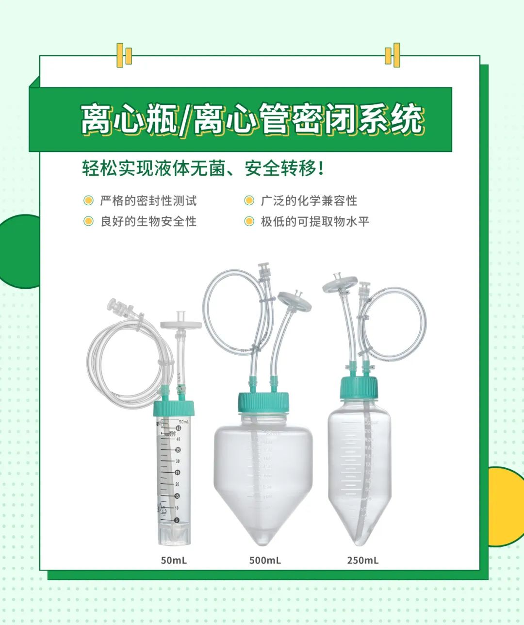 潔特生物離心瓶/離心管密閉系統(tǒng),優(yōu)選符合USP Class VI標準的原料在GMP標準潔凈車間制成,具有極低的可提取物水平以及良好的生物安全性,可用于全封閉式取樣及無菌移液。產品采用雙層包裝,每套系統(tǒng)均配備一個獨立包裝的密封蓋,可用其替換轉移蓋,便于后續(xù)的離心、檢測等操作。