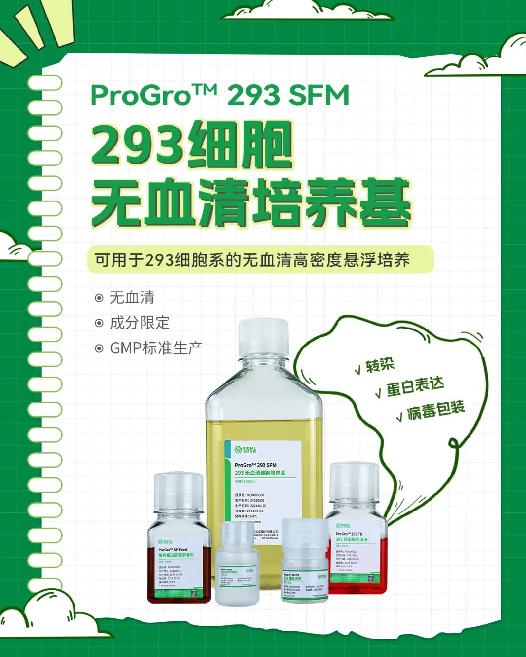 為幫助客戶能夠精準(zhǔn)選擇符合需求的產(chǎn)品,潔特生物特提供293細(xì)胞無(wú)血清培養(yǎng)基正裝免費(fèi)試用!正裝!正裝!正裝!重要的事說(shuō)三遍!你的培養(yǎng)基潔特生物為你買單!