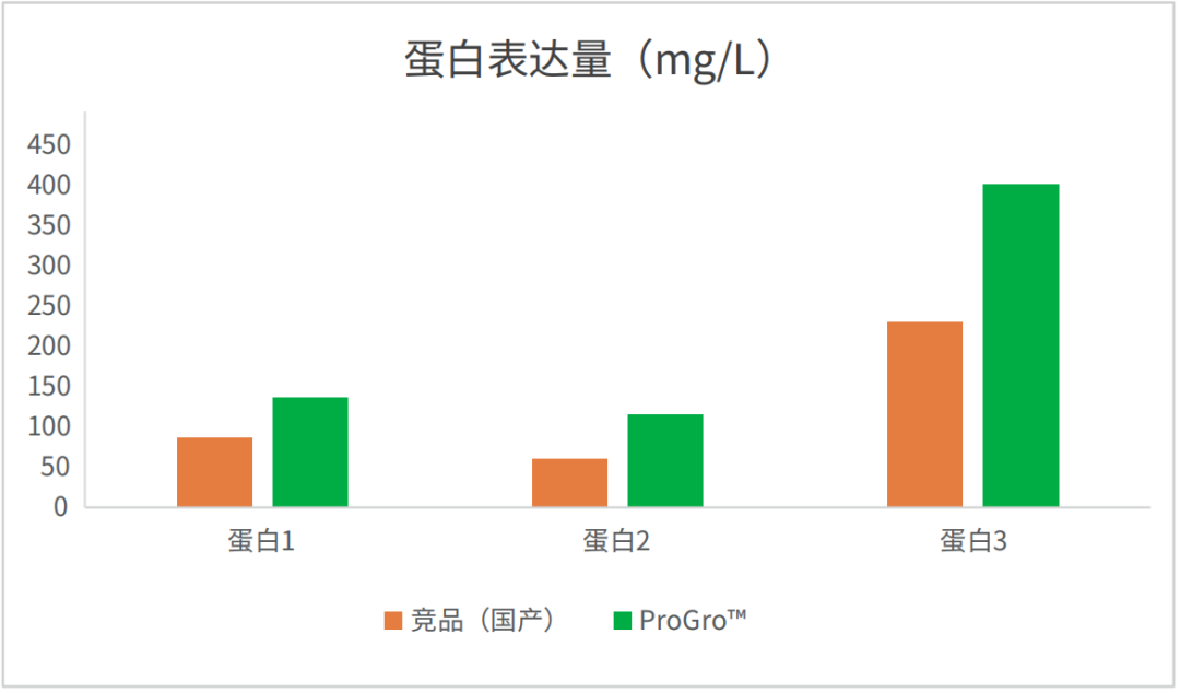 在ProGro™ 293 SFM和競(jìng)品培養(yǎng)基中分別培養(yǎng)293細(xì)胞,分別轉(zhuǎn)染三種不同的蛋白質(zhì)粒,表達(dá)后第六天進(jìn)行收樣,ELISA檢測(cè)蛋白表達(dá)量。在ProGro™ 293 SFM的表達(dá)系統(tǒng)中,三種蛋白的表達(dá)量均比競(jìng)品培養(yǎng)基高出三分之一或以上。