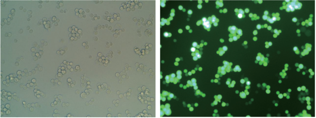 將4.0×106個(gè)/mL密度的HEK293細(xì)胞接種至ProGro™ 293 SFM,使用ProGro™ 293 TR 293細(xì)胞轉(zhuǎn)染試劑,轉(zhuǎn)染GFP基因質(zhì)粒,轉(zhuǎn)染48h后觀察細(xì)胞的轉(zhuǎn)染情況,轉(zhuǎn)染效率可達(dá)70-80%。