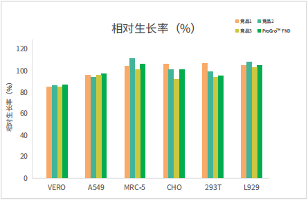 ProGro™進(jìn)口胎牛血清和知名進(jìn)口品牌南美來源胎牛血清分別培養(yǎng)6種不同細(xì)胞,ProGro™培養(yǎng)的各種細(xì)胞相對(duì)生長(zhǎng)率水平均與知名進(jìn)口品牌相當(dāng)。