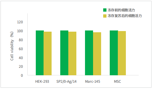 ProGro™國(guó)產(chǎn)胎牛血清分別培養(yǎng)不同細(xì)胞,測(cè)試其凍存前細(xì)胞活力以及凍存復(fù)蘇后細(xì)胞活力,前后細(xì)胞活力均表現(xiàn)優(yōu)秀。